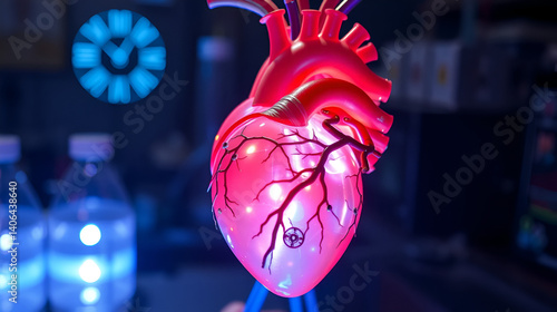A biomechanical human heart grown in a laboratory, glowing softly with artificial veins