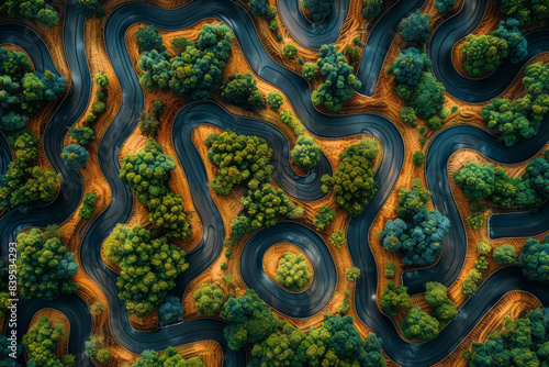 A bird’s-eye view of a complex race track, with giraffe spot patterns forming an intricate maze,