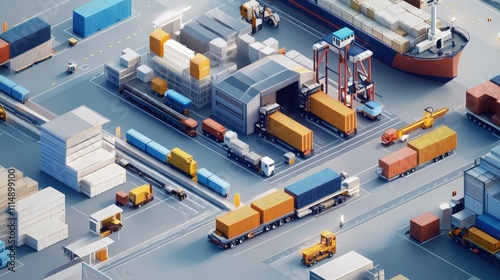 A birds-eye view of a logistics hub with trucks, cargo ships, and warehouses in motion, symbolizing global trade and transportation network growth.