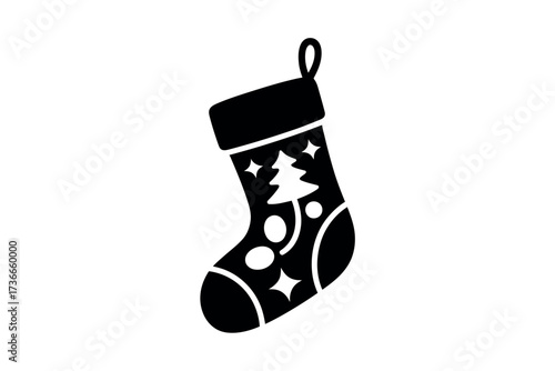 christmas, stocking, tree, holiday, decoration, festive, ornament, season, celebration, winter, gift, present, traditional, black, white, silhouette, design, vector, illustration, clip art, graphic, icon, symbol, art, drawing, isolated, background, pattern, circle, star, element, shape, template, merry, december, eve, hanging, seasonal, greeting, card, motif, simple