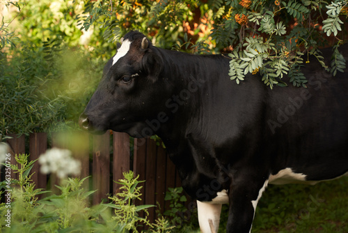 A black and white cow grazes on a green field with trees on a bright sunny day. Summer rural landscape close-up. High quality photo