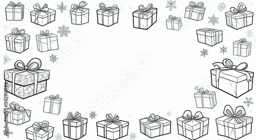 A black and white drawing of presents arranged in a circle, space for text
