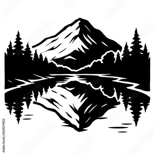 A black and white graphic illustration of a mountain and pine trees reflecting in a calm lake