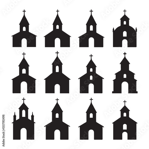 A black and white illustration of twelve distinct church buildings in various architectural styles. Each building has a unique silhouette.