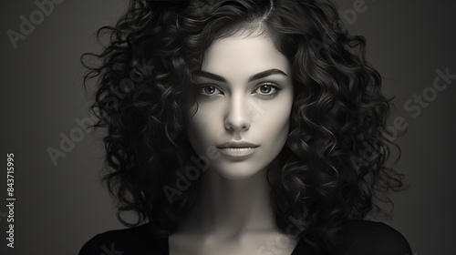 A black and white portrait of a young woman with elegant curly hair, her gaze exuding a timeless beauty and sophistication.