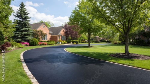 black, asphalt, road, house, background, brick, green, bush, tree, door, grass, street, home, architecture, lawn, residential, landscape, large, property, building, summer, neighbourhood, outside, community, modern, sky, blue, exterior, estate
