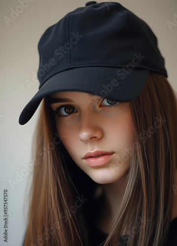 A black blank baseball cap, worn by a female with long brown hair, black baseball cap, cap for mockup, mockup