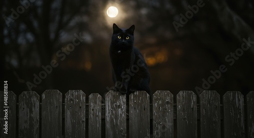 A black cat sits perched on a weathered wooden fence under a bright, blurred moon at night.