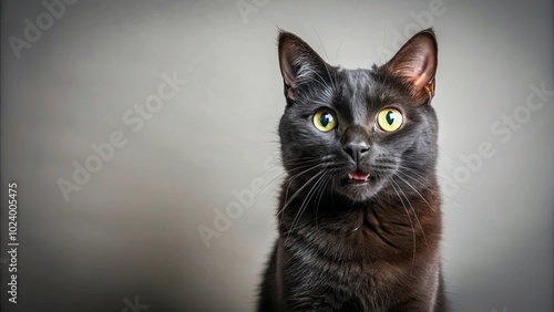 A Black Cat With Wide Eyes and a Slight Grin, Against a Soft Grey Background