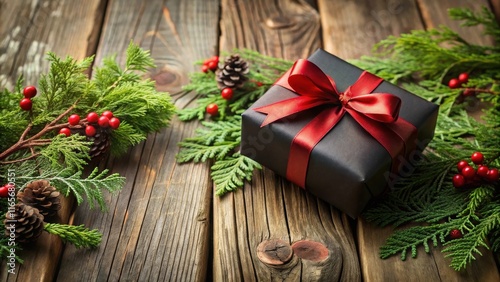 A Black Gift Box with a Red Bow, Surrounded by Evergreen Sprigs and Red Berries, Set on a Rustic Wooden Surface