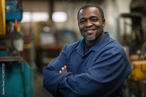 black man, workshop, industrial, tool, smiling, arms crossed, equipment, confidence, 30s, embracing, professional, happiness, manufacturing, craftsmanship, portrait, labor, workplace, focused, skilled, support, team, hard hat, manual labor, apron, machinery, technician, craftsman, teamwork, dedication, pride, career, employment, occupation, safety-gear, community, engineering, mechanic, safety, technology