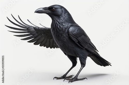 bird, raven, crow, black, wing, feather, animal, wildlife, nature, isolated, white, background, studio, photo, image, picture, graphic, design, element, illustration, artwork, digital, art, three-dimensional, render, model, creature, avian, fauna, beak, eye, leg, foot, talon, plumage, dark, mysterious, ominous, smart, intelligent, symbol, mythology, folklore, gothic, mystical, silhouette, profile, view, side