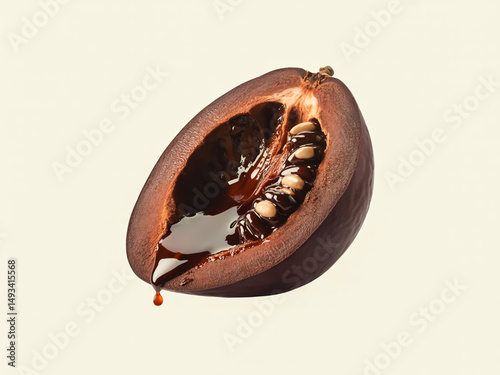 A black sapote halved isolated on white background soft chocolate like flesh clean studio shot
