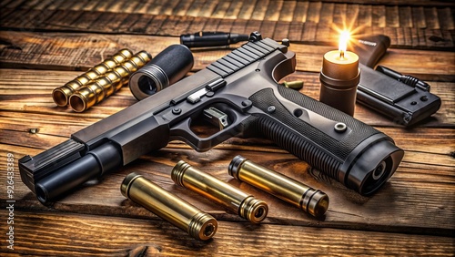A black semi-automatic handgun with a mounted flashlight and laser sight lies on a wooden table surrounded by assorted ammunition and shooting accessories.