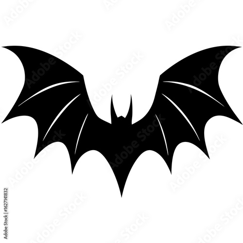 A black silhouette of a bat with outstretched wings and sharp points against a white background