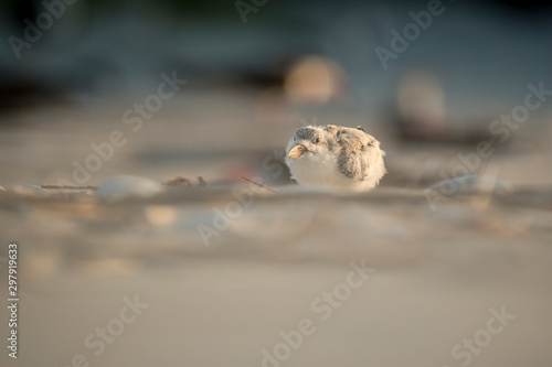 A Black Skimmer chick on the sandy beach in the early morning sunlight.