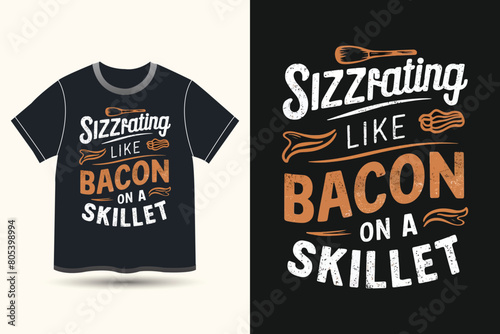 a black Tshirt with the words quote Sizzling like bacon on a skillet