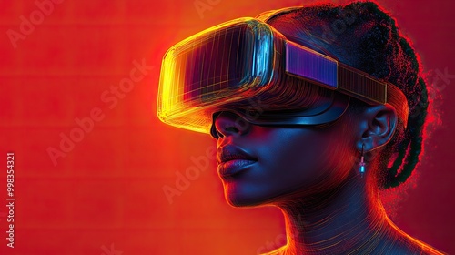 A black woman wearing a VR headset is illustrated with glowing lines.