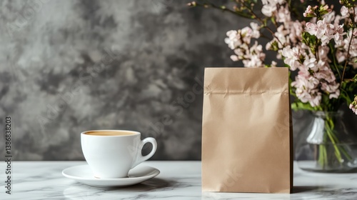 a blank brown kraft paper coffee bag mockup next to a white cup with a saucer on a marble table and a grey wall background