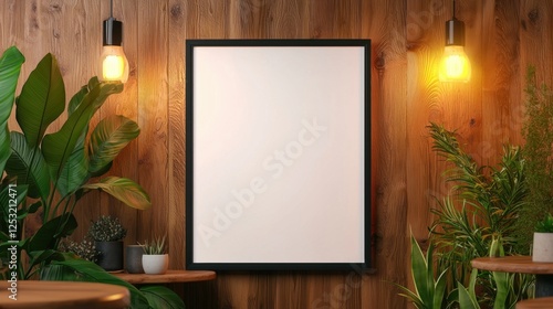 A blank frame hanging in a cozy cafe corner, surrounded by plants and warm lighting