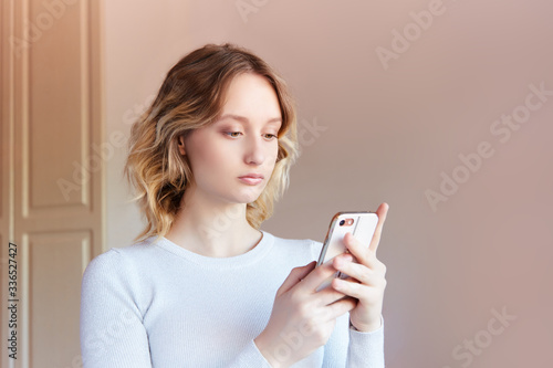 A blonde girl looks at her mobile phone. At home in a room a young student girl looks at her phone.