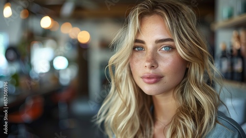 blond, woman, smile, camera, make-up, cosy, intimate, light, indoor, approachable, warm, soft, friendly, beautiful, modern, lifestyle, female, single, portrait, happy, glow, joy, contentment, bright, emotional, contemporary, closeup, natural, home, fashion, radiant, youthful, vibrant, clean, elegant, daylight, style