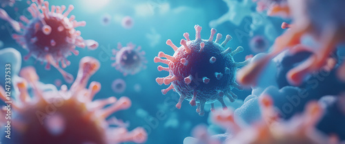 A blue background with a close-up of different types of coronaviruses, in a medical, realistic, macro photography style, with 3D rendering, high resolution.