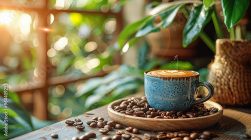 A blue coffee cup with a white plate of coffee beans and a plant in the background. Scene is calm and relaxing