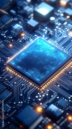 A blue digital background featuring an isometric view of a microchip with glowing lights and interconnected connections