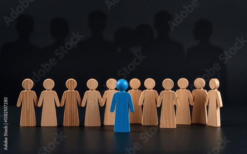 A blue figure stands out in a group of wooden figures, casting shadows on a dark backdrop. The unique individual stands apart from the unified group.