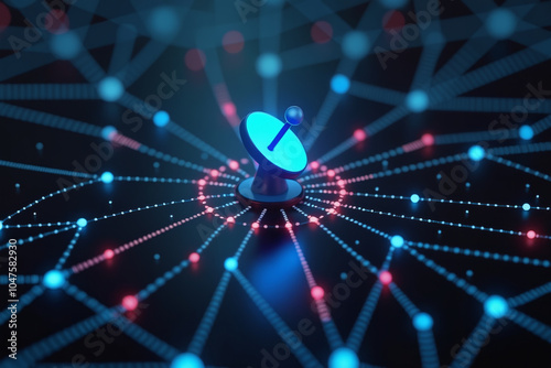 A blue satellite dish on a dark background, surrounded by connected lines and dots, symbolizing digital networks and location.