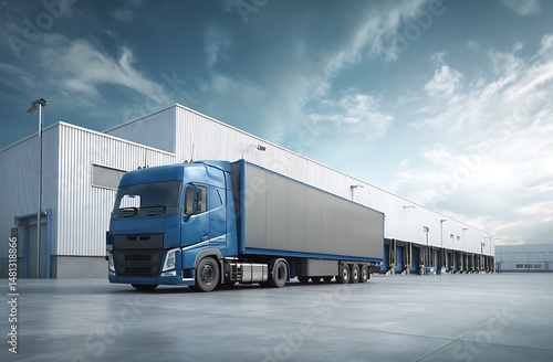truck, semi, trailer, blue, warehouse, building, sky, cloud, transportation, logistic, delivery, freight, commercial, vehicle, exterior, dock, bay, industry, distribution, shipping, cargo, transport, business, road, drive, automobile, transporting, industrial, trade, export, import, supply, chain, storage, good, merchandise, cloudy, day, sunny, large, parked, front