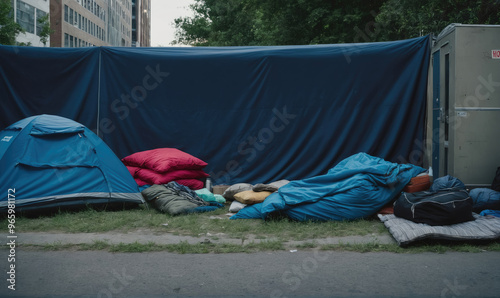tent, tarp, sleeping-bag, pillow, building, homeless, sleeping, shelter, outside, urban, city, night, day, street, grass, sidewalk, exterior, person, community, poverty, hardship, wants, help, resource, city life, urban life, assistance, support, survival, necessity, essential