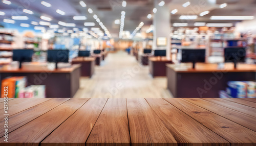 A blurred bookstore interior with rows of bookshelves, seen from a clear wooden tabletop
