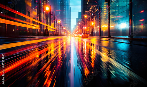 A blurred, defocused image of traffic lights in motion, creating colorful light trails that convey the fast-paced rhythm of the city.