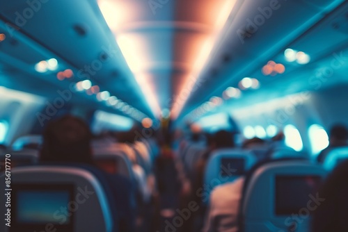 A blurred view of an airplane cabin interior, capturing the essence of travel and flight, perfect for travel-themed projects.