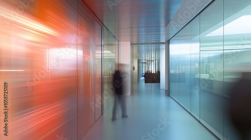 A blurry photograph of an office setting. The open corridor is flooded with natural light from the glass wall on the left