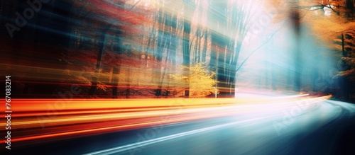 A blurry picture of an asphalt road cutting through a forest with shades of amber and electric blue. The horizon is barely visible, creating a captivating visual arts event