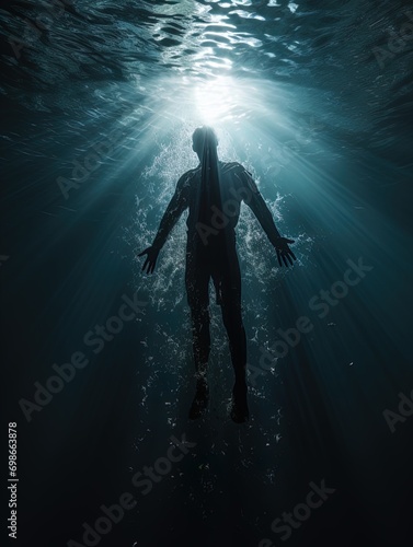 A body suspended in the ocean with rays of light shining on it. Great for stories of crime, murder, horror, mystery, danger and more.