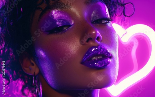 A bold beauty look with intense violet makeup and glossy purple lips, with a neon pink heart bokeh effect behind her