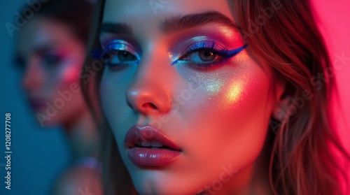 A bold makeup look featuring neon eyeliner in vivid hues, highlighting creative and artistic beauty with a fashion-forward, edgy style.