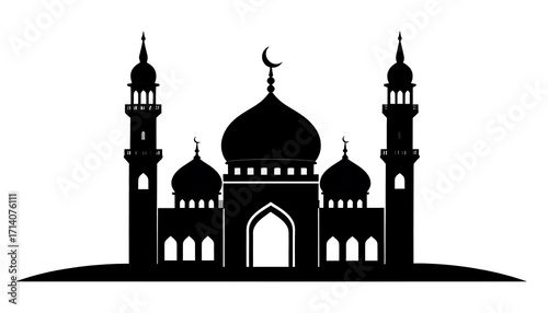 A bold, symmetrical silhouette of a mosque, showcasing its architectural details against a plain white background.