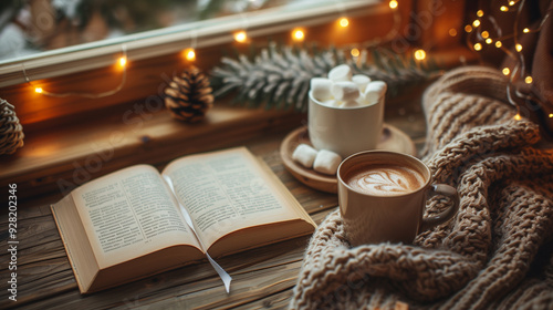 a book on a wooden table with a wool blanket and a cup of warm cocoa with marshmallows