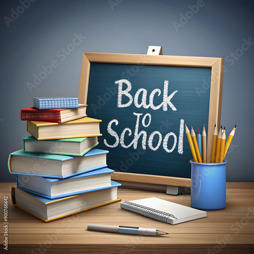 A book with a black background that says back to school, A poster for back to school with a chalkboard and a pencil on the wall