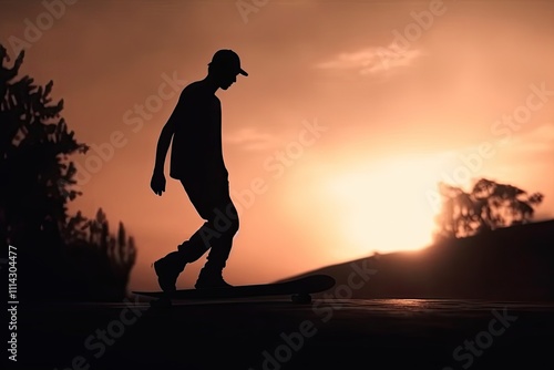 A boot of a skateboarder's shoes is standing on a skateboard ride in the sunset on the road .