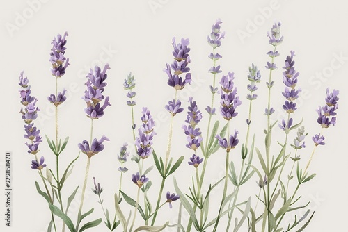A botanical illustration of a lavender plant, showcasing its tall stems and small purple flowers in fine detail