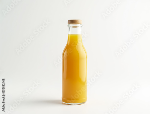 A bottle filled with freshly squeezed orange juice stands upright on a clean, bright background. The smooth glass highlights the rich, vibrant orange color of the juice.