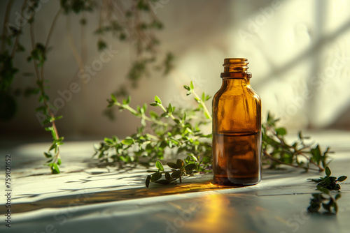 A bottle of aromatherapy essential oil with fresh thyme twigs on a sunny day