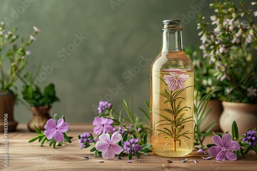 A bottle of herbal tea with a flower on the label is on a table with a bunch of