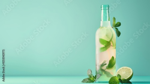 A bottle of Mojito complements the glass filled with ice and mint, set against a soft pastel background for a fresh look.